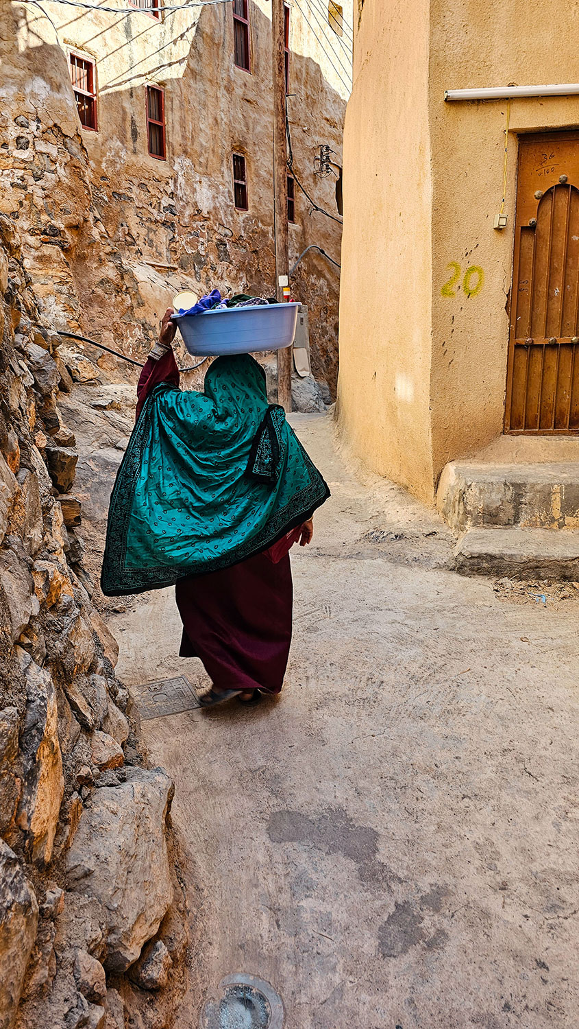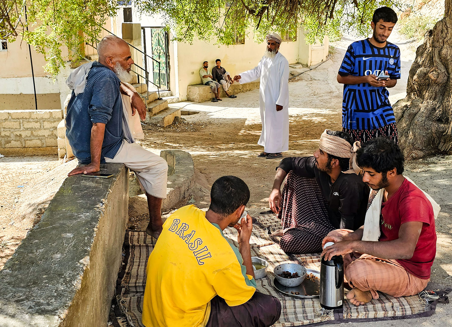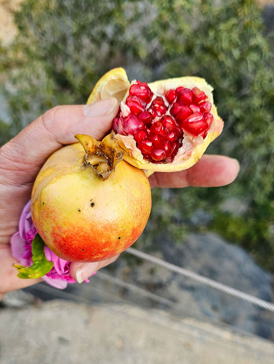Bei angenehmen 24 Grad schwimme, rutsche und wandere ich durch die Schlucht. Mohammed ist das Wasser zu kalt, er kraxelt am Hang entlang, während ich mich von einem Wasserpool zum anderen durch die Schlucht arbeite. Ich genieße die Ruhe – allein in dieser Naturkulisse fühlt es sich an wie ein kleines Paradies. Der Rückweg? Wieder ein kleines Abenteuer! Zum Glück ist Mohammed genau im richtigen Moment zur Stelle. Bei der Passage mit dem Seil hilft er mir hinauf. Zurück im Dorf begrüßt mich Mohammeds Vater mit Kaffee und Datteln und ich erlebe echte omanische Gastfreundschaft.