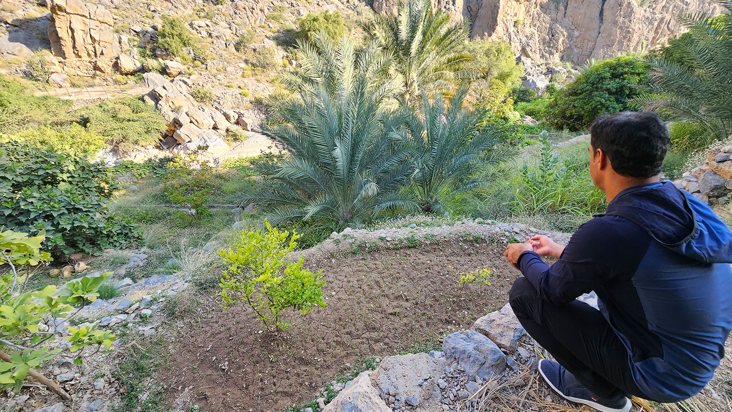 In Misfat Al Abriyeen, auf 900 Metern Höhe, erstrecken sich über dem Wadi Al-Saq die Plantagen der Bauern. Dank der traditionellen Falaj-Kanäle gedeihen hier Obst und Gemüse inmitten einer atemberaubenden, aber steinigen und kargen Berglandschaft. Die Parzellen liegen unter großen Dattelpalmen. Ahmed führt mich durch seine Plantage und berichtet mir, wie und was er hier anbaut.