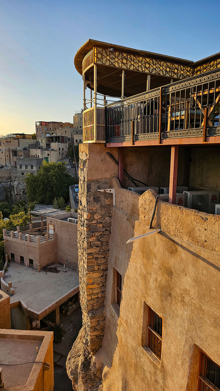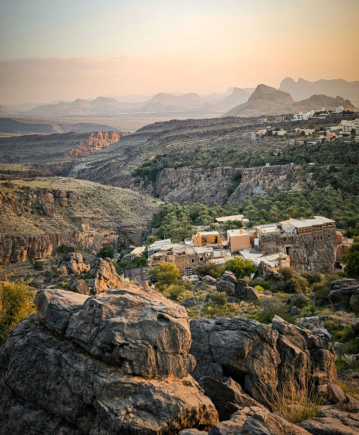 Mein fünfter Tipp führt nicht – wie so viele andere Wadis – hinunter ins Tal, sondern hoch hinaus. Die beiden Schluchten Wadi Nakhar und Wadi Ghul formen gemeinsam das, was oft als der „Grand Canyon des Oman“ bezeichnet wird – und das zu Recht: Die Felswände fallen hier über 1.000 Meter steil ab. Der Ausblick von oben ist einfach atemberaubend. Vom Dorf Misfat Al Abriyeen bin ich mit dem jungen Paar aus Belgien dort hin gefahren. Die Anfahrt führte zum Teil über Schotterwege. Doch wir haben es auch ohne Allrad geschafft.