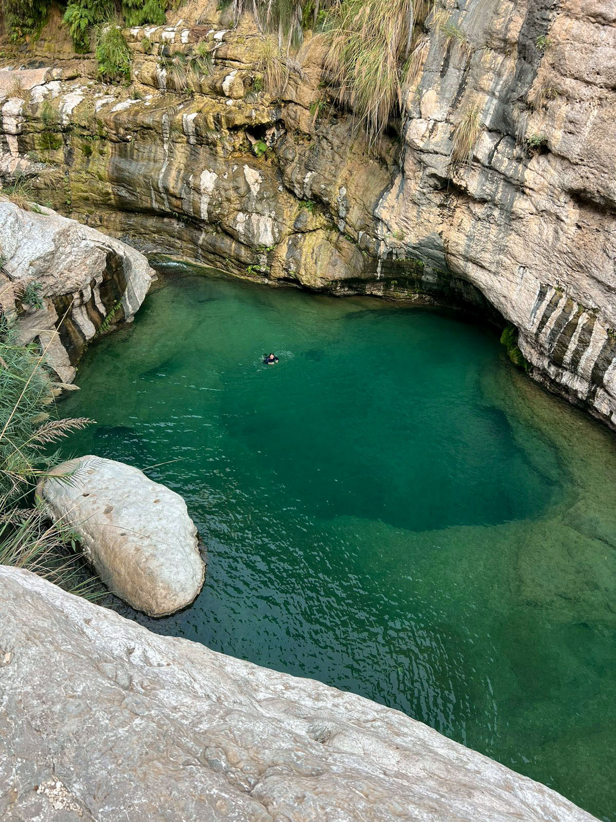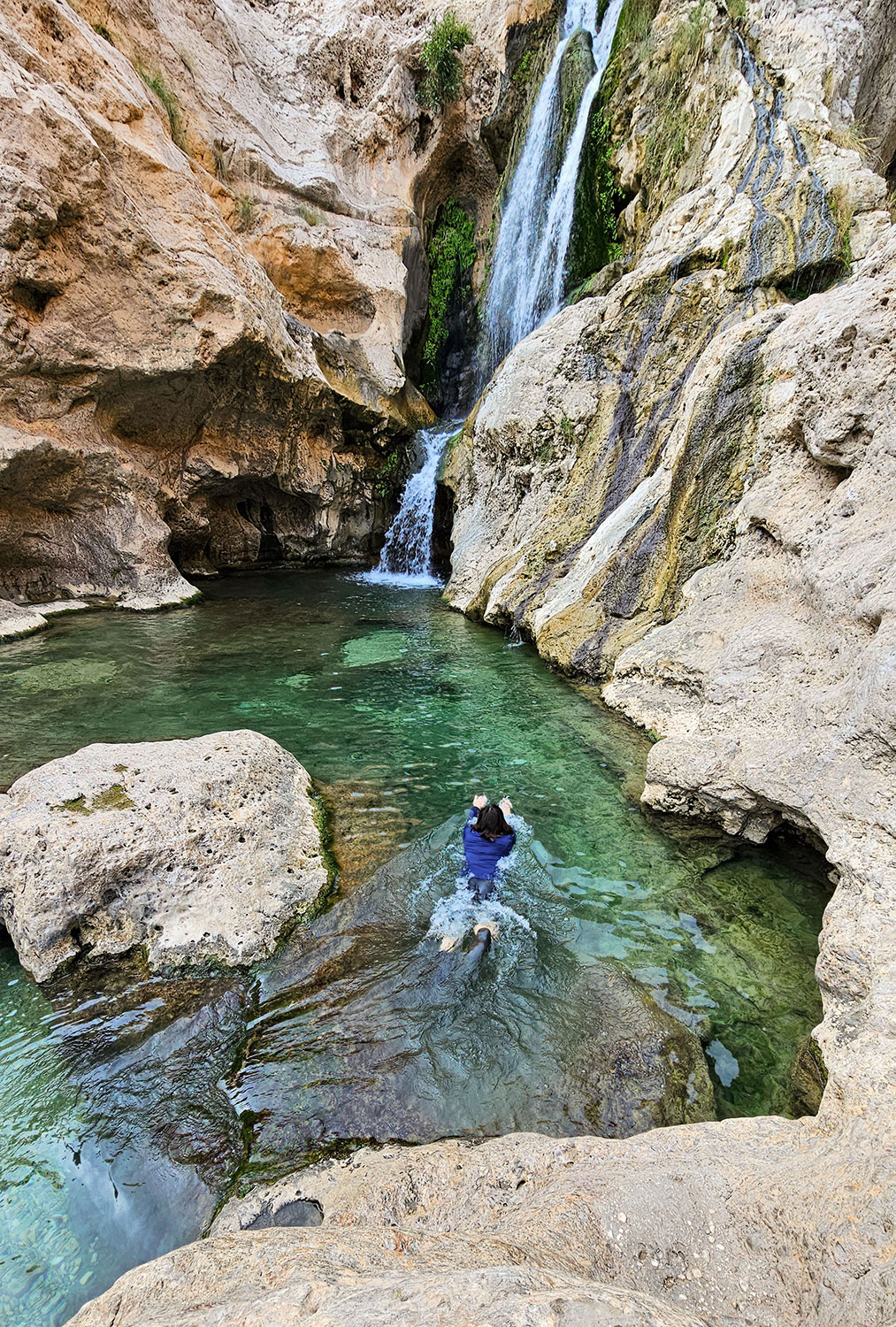 Nach etwa einer Stunde erreichst du die ersten Wasserbecken – glasklar und in intensiven Smaragd- und Türkistönen schimmernd. Ab hier heißt es: Wanderschuhe aus, Badesachen an – und los! Schwimmend gelangst du immer tiefer ins Wadi hinein. Der spektakulärste Moment kommt zum Schluss: eine Höhle, die man durch eine schmale Felsspalte erreicht. Drinnen: ein Wasserfall und fast mystische Lichtverhältnisse.