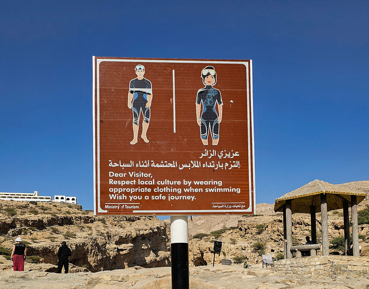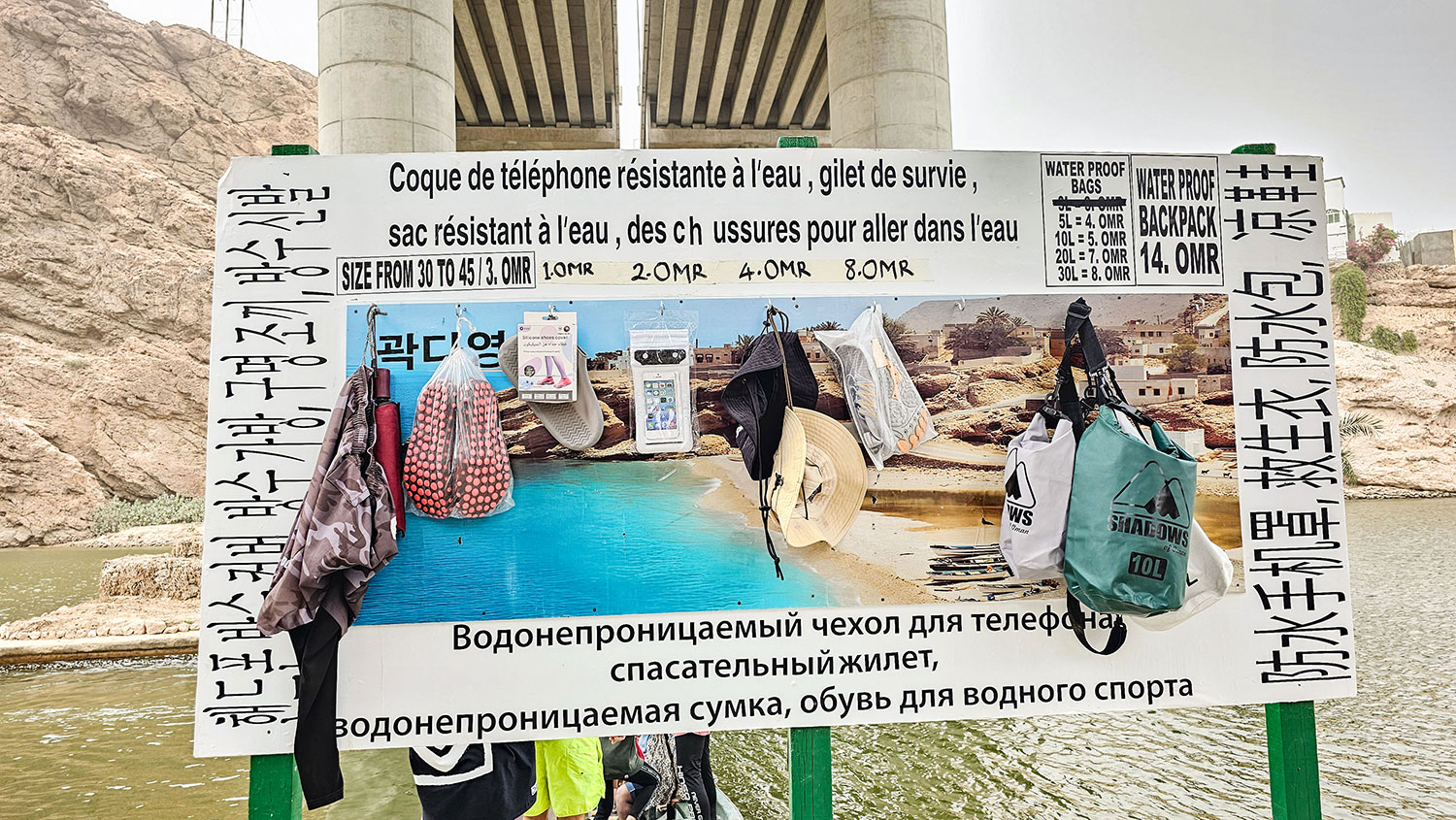 Einrichtungen: Gleich am Eingang unterhalb der Autobahnbrücke befinden sich ein Parkplatz, öffentliche Toiletten und ein Café. Das Übersetzen mit dem Boot kostet 1 OMR für die Hin- und Rückfahrt. Wasserdichte Packtaschen & Schwimmschuhe kannst du am Parkplatz kaufen.