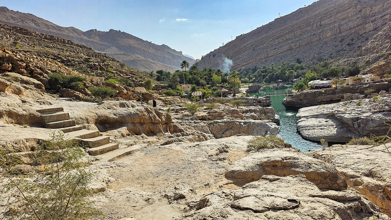 Der Eingang zum Wadi liegt unterhalb der modernen Autobahnbrücke der N17. Von dort setzt man mit kleinen Booten über einen schmalen See (Kosten: 1 OMR hin und zurück) über – dahinter beginnt die Wanderung durch grüne Palmengärten. Ein Zyklon hatte im Jahr 2007 große Zerstörungen angerichtet, doch die Natur kämpft sich zurück und die Bauern legen ihre Felder neu an.