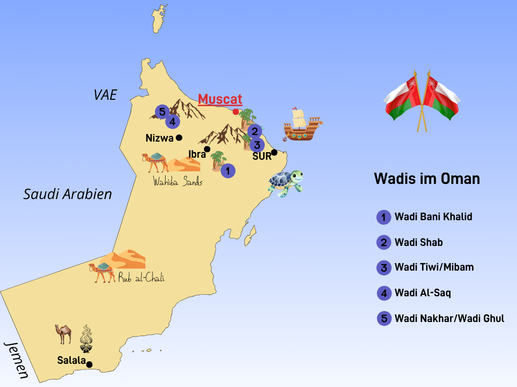Mein Vorschlag für dein Wadi-Abenteuer Für uns Reisende sind Wadis ein echtes Naturerlebnis – ein Wasser-Abenteuerspielplatz zum Wandern, Klettern und Schwimmen. Doch für die Menschen im Oman bedeuten sie weit mehr: Wadis sind lebenswichtige Wasserquellen, die Pflanzen, Tiere und ganze Dörfer mit Wasser versorgen. Diese empfindlichen Ökosysteme verdienen unseren Respekt. 👉 Deshalb: Bitte hinterlasse keinen Müll, bleib auf den Wegen und schütze die Natur.