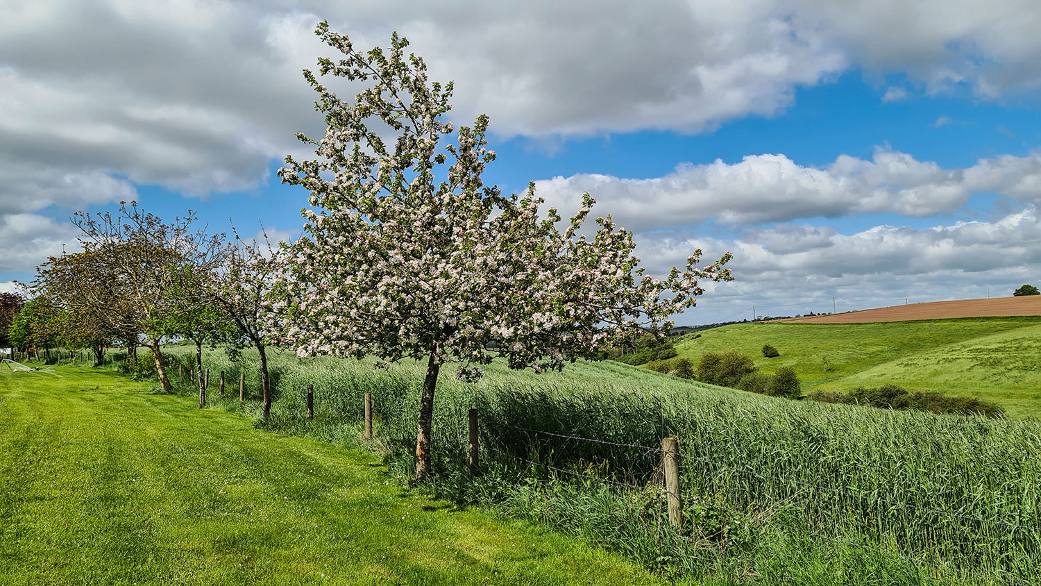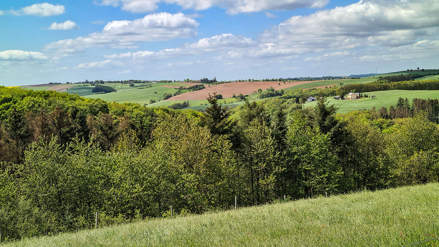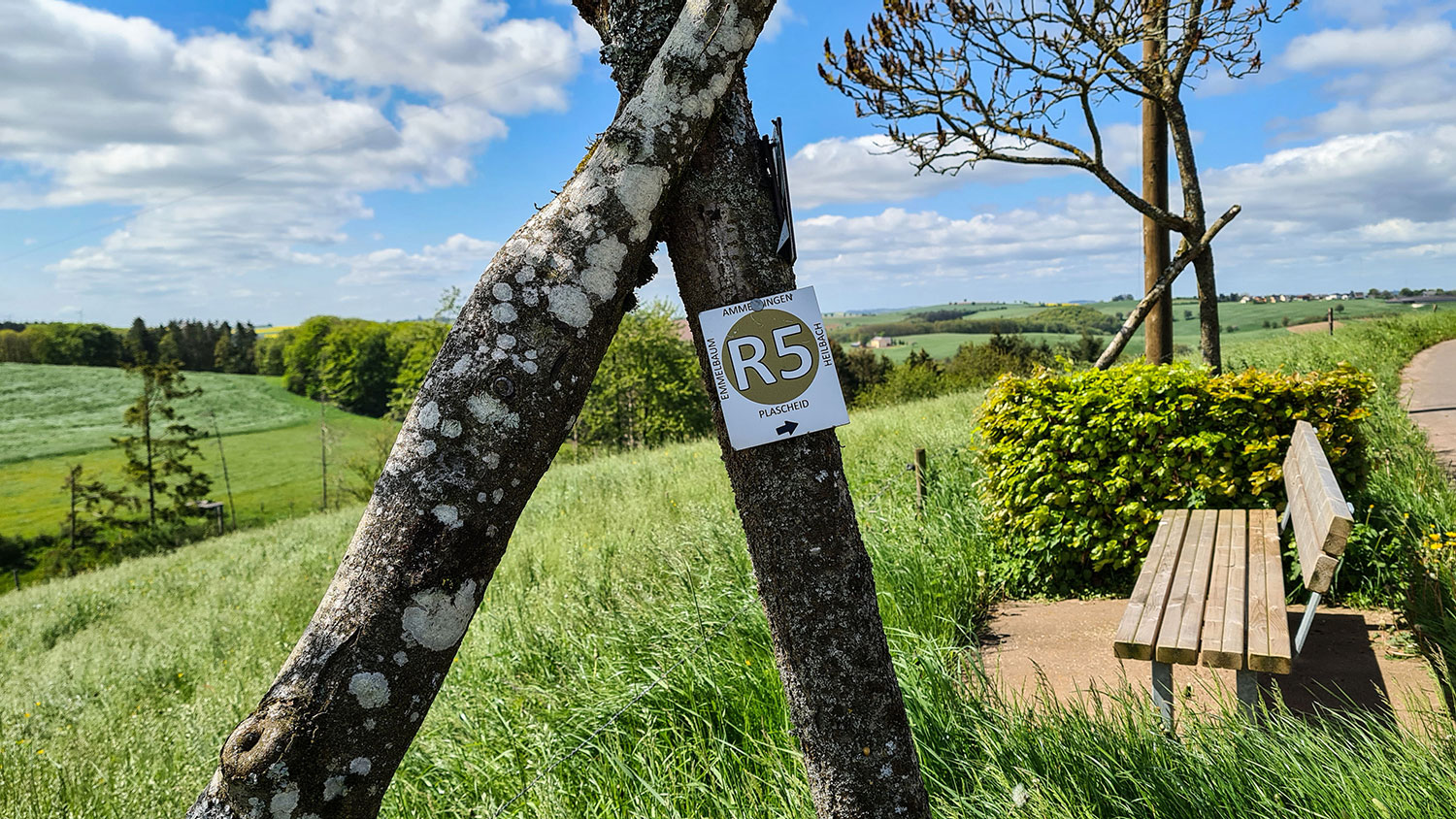 Wir wandern zunächst auf der Hauptstraße Richtung Arzfeld und nehmen am Ortsausgang den geteerten Feldweg, der linker Hand am Hang verläuft. In den Dorfgärten blühen Apfelbäume und vor uns breitet sich die Eifellandschaft aus. Sonne und Wolken veranstalten ein abwechslungsreiches Spiel am Himmel. Der Wind bläst kräftig und wir sind froh, dass wir die Jacken anhaben. Schon bald folgt die erste Bank. Von ihr genießen wir den Blick auf Emmelbaum und ins unverbaute Tal. Die Dorfbewohner haben eine kleine Hecke um die Bank gepflanzt, die schützt vor den ärgsten Windböen.