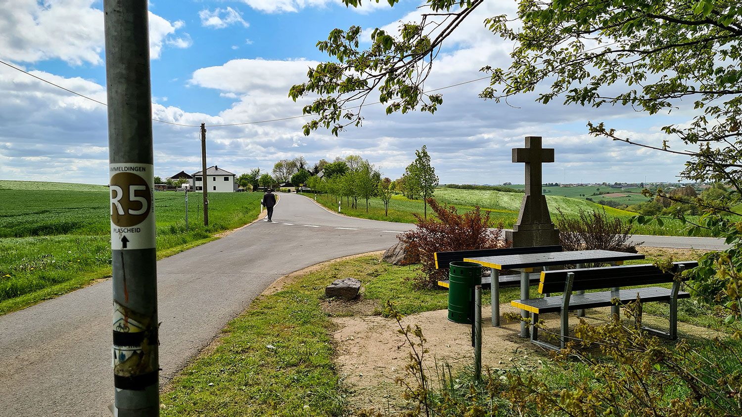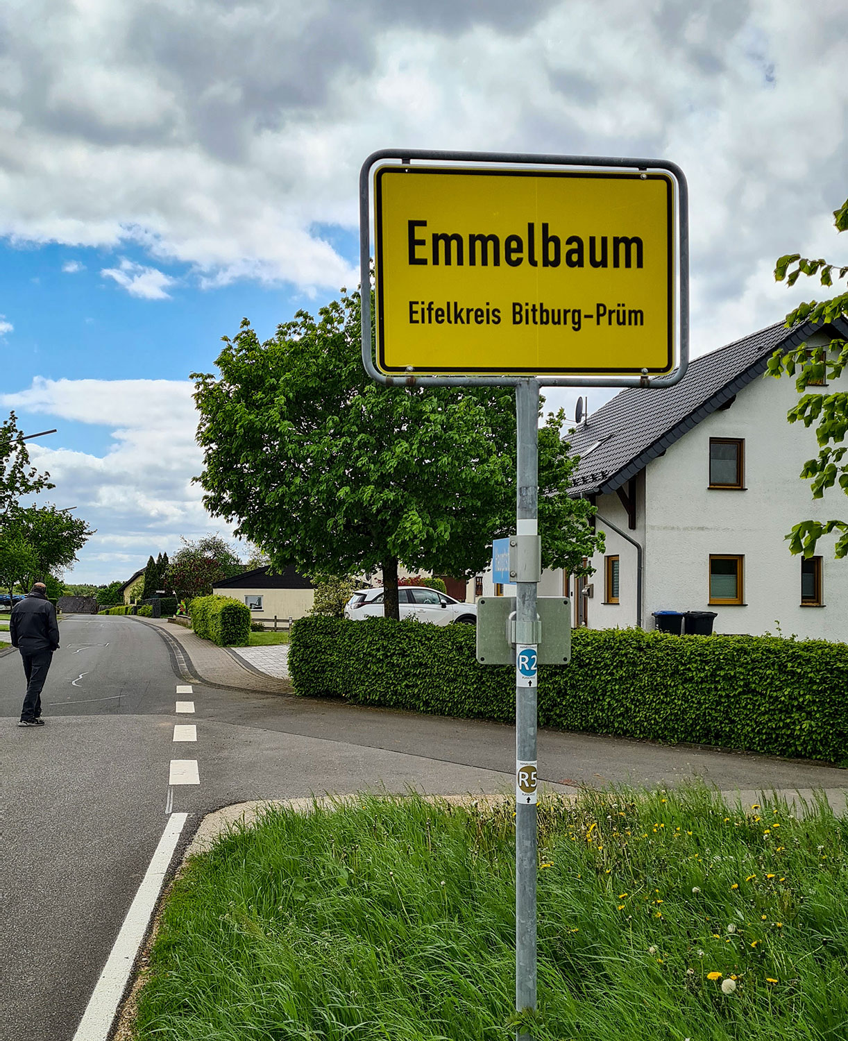 Emmelbaum, den Ortsnamen hatte ich vorher nie gehört, obwohl ich doch aus dem Eifelkreis stamme. Das Dorf liegt auf knapp 500 Metern Höhe, acht Kilometer nördlich von Neuerburg. Nahe der kleinen Marienkapelle startet dieser 4 Kilometer lange Rundweg, der meist auf befestigten und geteerten Feldwegen verläuft. Entdeckt haben Ralph und ich ihn auf der Wanderwege-Infotafel vom Campingplatz „In der Enz“. Klar, dass wir ihn auch ausprobiert haben.