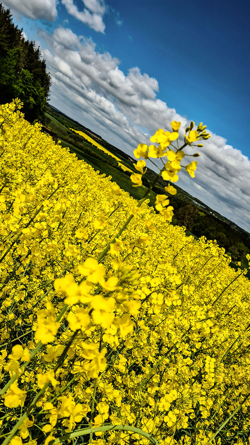Im Frühjahr mischen sich unter das satte Grün der Felder, Wiesen und Wälder gelbe Farbtupfer: Löwenzahn und Hahnenfuß blühen auf den Weiden, Rapsfelder verwandeln sich in ein strahlendes Gelb und am Waldrand und auf den kargen Höhen leuchtet der Ginster. Diese geballte Gelbvielfalt habe ich auf dem schönen kleinen Rundwanderweg R5 bei Neuerburg in der Südeifel erlebt.