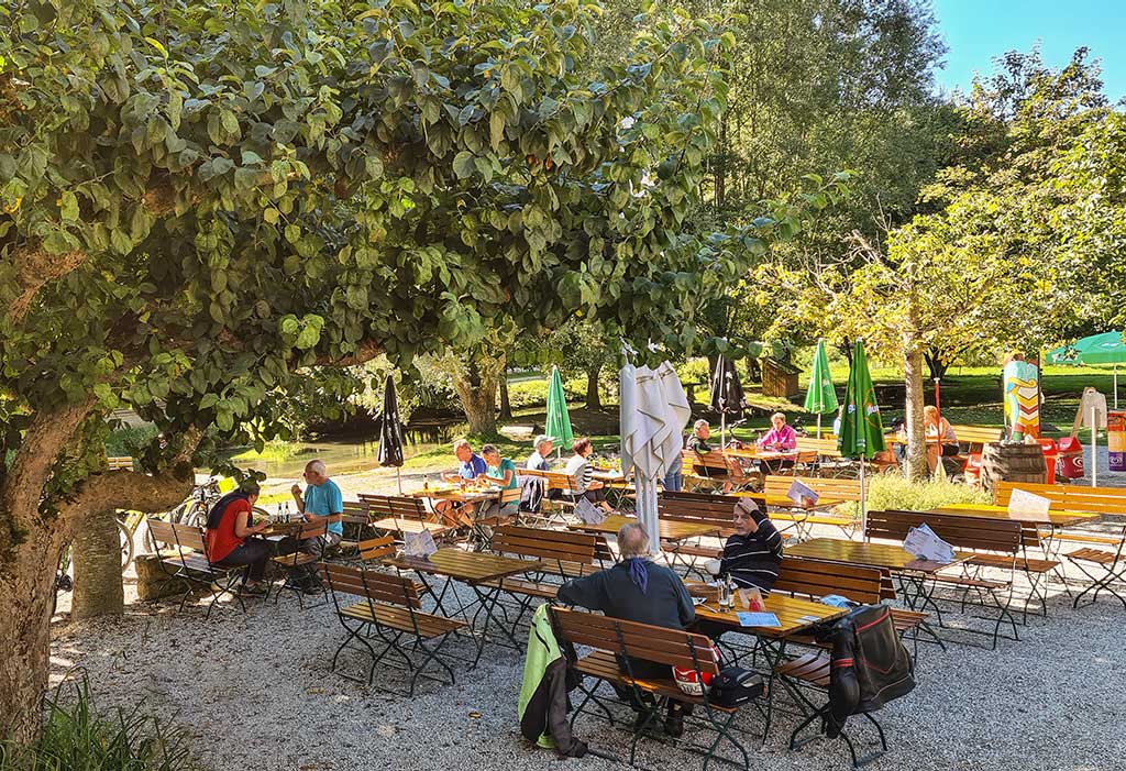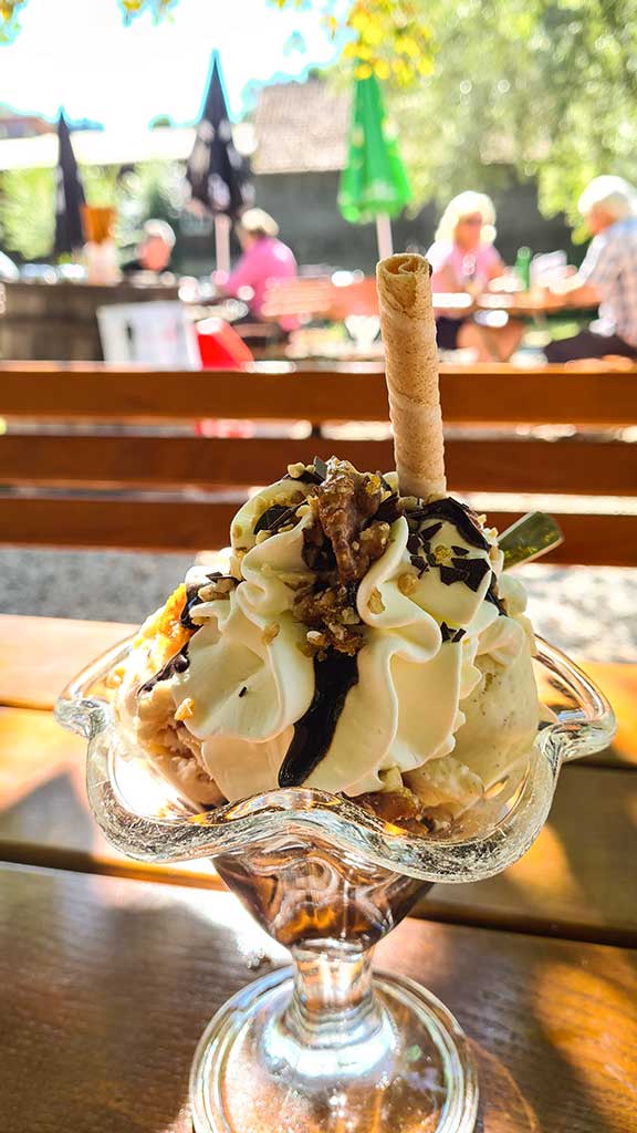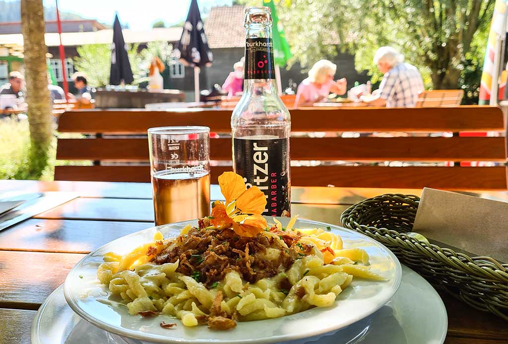 Ausgangspunkt der heutigen Wanderung ist das Bootshaus in Bichishausen. Es ist Mittagszeit und ich hatte nicht gefrühstückt, also erst einmal rein in den Biergarten. Die Kässpätzle sehen nicht nur schön aus, sondern schmecken auch gut. Zum Abschluss genehmige ich mir noch einen Walnuss-Krokant-Becher. Damit ist eine ordentliche Grundlage für die bevorstehende Wanderung geschaffen.