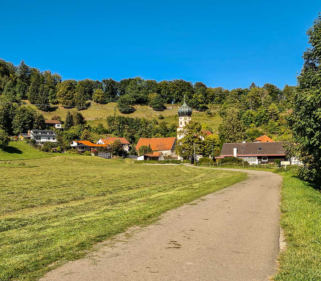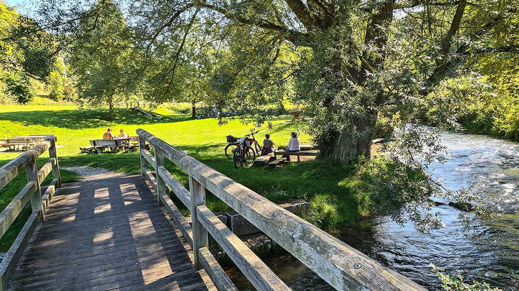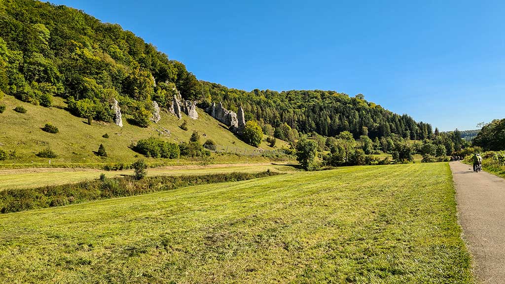 Ich marschiere auf der Fürstenbergstraße durch Bichishausen. Über dem kleinen Ort wacht die Felsenburg, die lasse ich aber rechts liegen und gehe schnurstracks auf die Pfarrkirche mit dem Zwiebelturm zu. Anschließend folge ich dem Lautertalradweg. In den Gärten blühen Astern, Sonnenblumen und Sonnenhut, es riecht nach frisch gemähtem Gras. Am Ortsausgang gibt es einen schönen Spielplatz mit Liegewiese und Grillmöglichkeit… ja touristisch ist das Tal der Großen Lauter sehr gut erschlossen. Auf dem Radweg ist schon mächtig was los, der Freitagnachmittag lockt die ersten Wochenendausflügler auf die Alb. Wanderer und Radfahrer nutzen im Tal den gleichen Weg und ein bisschen beneide ich die Radler, kommen sie doch schneller voran.