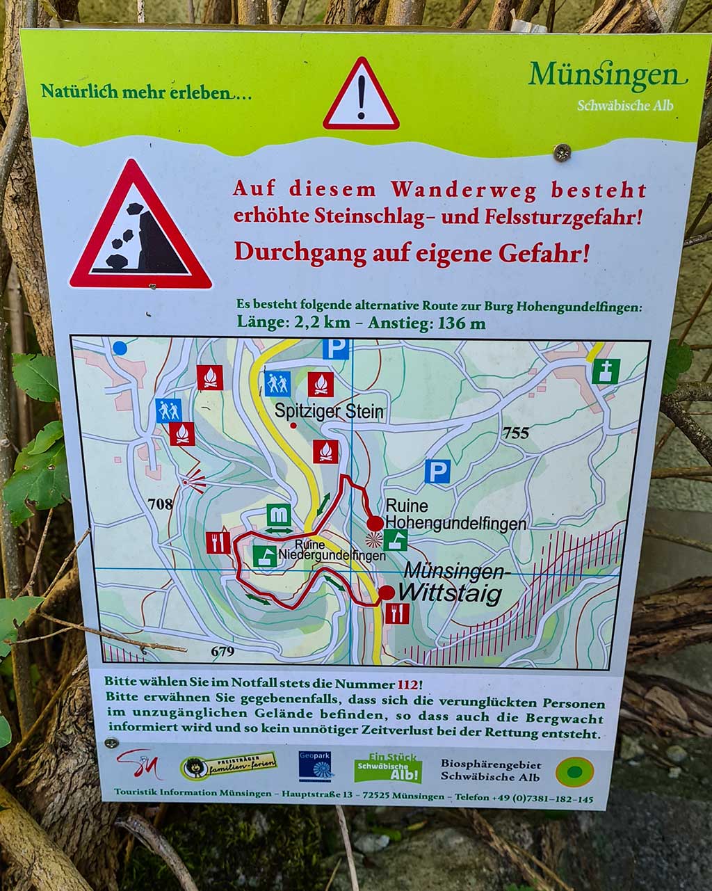 Am höchsten Punkt der Festung kannst du durch ein Fernrohr schauen und an klaren Tagen sogar bis zu den Alpen sehen. Die Ruine Hohengundelfingen liegt an mehreren Rundwegen („hochgeswiggert“) und ist gut besucht. Bewirtet wird sie nicht, aber es ist ein herrlicher Platz zum Vespern und Picknicken. Den Abstieg nimmt der HW 5 über einen felsigen, steinigen Pfad bis zum Wittstaig. Auf diesem Kilometer warnen Tafeln vor erhöhter Steinschlaggefahr.