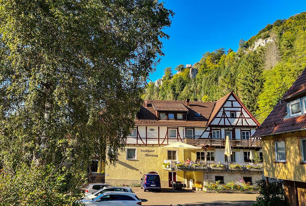 Am Landgasthof Wittstaig überquere ich die Lauter und wandere dann Achtung! ein paar Meter rechts zurück, bevor der HW 5 wieder links in den Wald führt. Vor dem nächsten Aufstieg genieße ich noch einmal den Blick vom Tal auf die Ruine Hohengundelfingen.