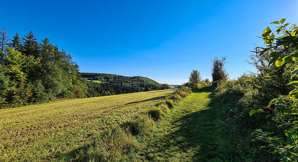 Gegen Mittag mache ich mich auf den Weg, die unerledigten sechs Kilometer von gestern zu absolvieren. Same procedure as last day: Das Auto stelle ich unten am Parkplatz der Burg Derneck ab und fahre dann mit dem Linienbus bis Bichishausen. Mit der Albcard ist das super, ich muss kein Ticket lösen, nur den Pass vorzeigen.