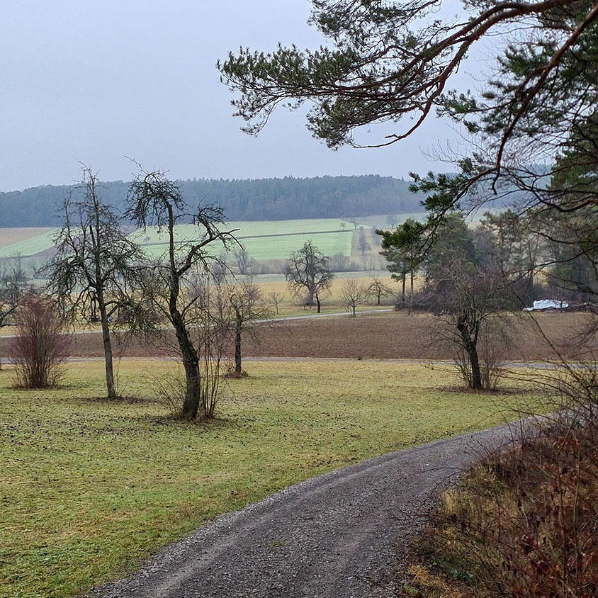Wir, das sind mein Mann Ralph und ich. Ausgangspunkt der heutigen Tour ist die Ortsmitte von Steinegg. Wir marschieren die Liebenzeller Straße hoch und biegen dann links in die Uhlandstraße ein, die am Steinegger Friedhof vorbei in den Wald führt. Unser Wanderweg ist ein breiter Fahrweg und ziemlich matschig. Der Schnee war mittlerweile geschmolzen, und die vergangenen Tage hatten für reichlich Nässe gesorgt. Heute regnet es zum Glück nicht, der Himmel ist bedeckt, die Aussicht eher trüb. Und doch ist es richtig schön, die Natur verharrt ganz still und ruhig.
