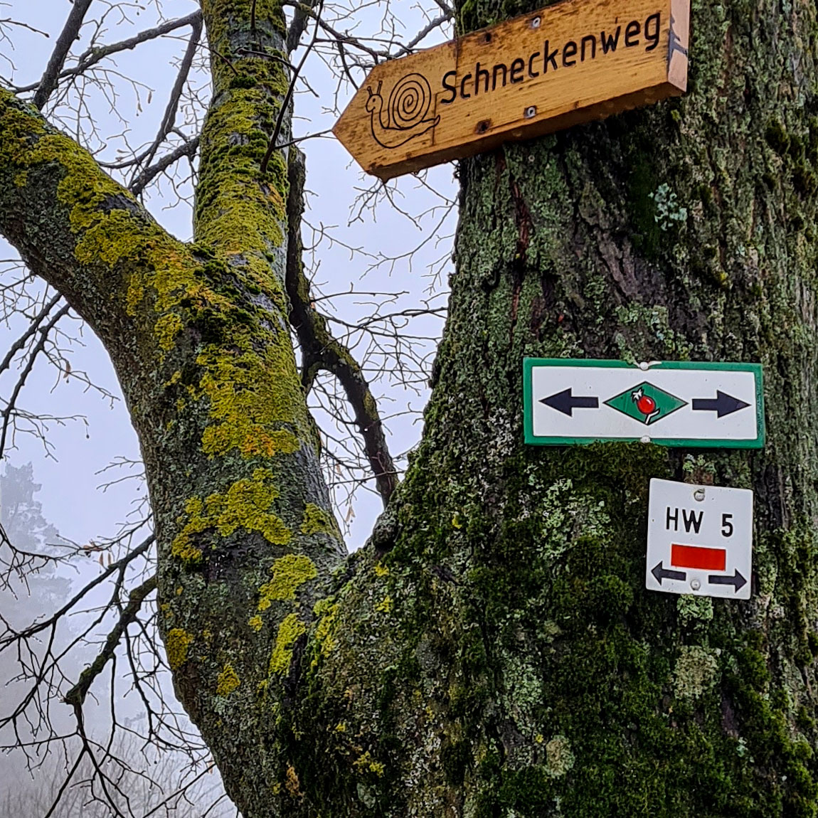 Es gibt einen kleinen und einen großen Rundweg, wobei die Beschilderung für den HW 5 ein wenig verwirrend ist. Letztendlich entschieden wir uns für die große Runde vom Parkplatz Büchelberg bis zum Aussichtspunkt Heckengäu und dann hinunter zum Wegweiser Landgraben. Von dort aus hat man normalerweise einen herrlichen Blick auf Münklingen. Auf halber Höhe führt der Weg dann weiter am Reiterhof Toll vorbei bis zur Liebenzeller Landstraße, die wir überquerten. Auf der gegenüberliegenden Straßenseite verwandelt sich der HW 5 für einen kurzen Abschnitt wieder in einen schmalen Pfad. Er schlängelt sich durch den Wald und mündet dann in den Köpflesweg. Auf dem ging es dann aus dem Wald heraus, hinein in den Nebel.