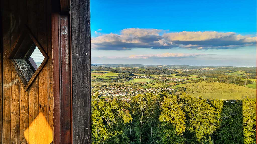 Der Sternberg (844 Meter über N.N) ist ein vor Urzeiten erloschener Vulkan. Auf seinem Gipfel befindet sich ein Aussichtsturm des Schwäbischen Albvereins und daneben ein hässlicher Sendemast. Ralph streikt. Er möchte gar nicht mehr auf den Turm, ich bin aber neugierig, 32 Meter ist er hoch und entsprechend viele Stufen (140 habe ich gezählt). Die Aussicht war aber wie immer fantastisch.