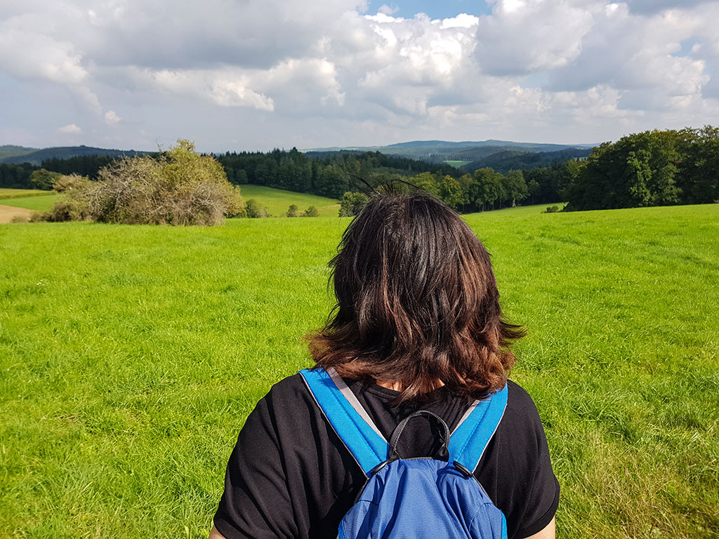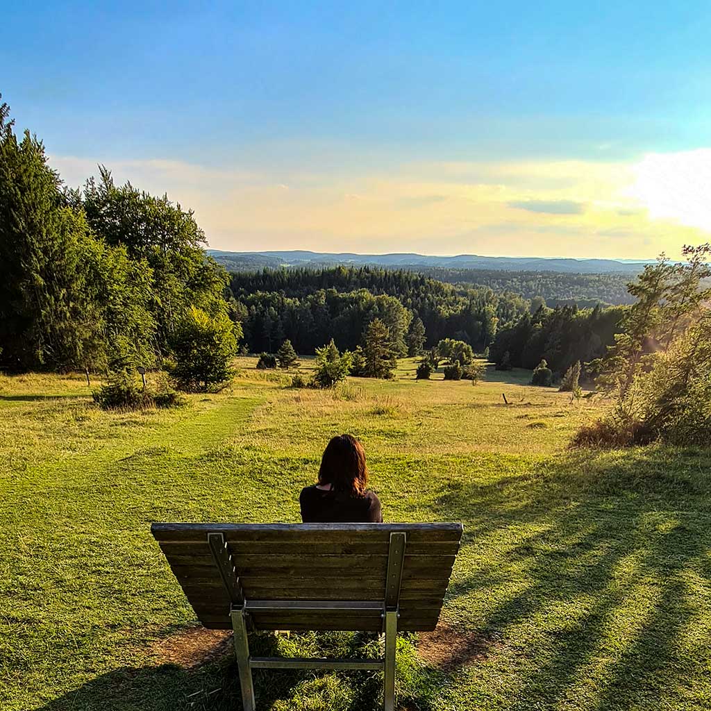 Auf der Höhe lassen wir den Wald hinter uns und freuen uns an der saftigen Wiese und dem weiten Blick. In der Ferne sehen wir schon den Sternberg. Aber der Weg zieht sich, führt wieder in den Wald hinein und bis wir dort sind, haben sich die Wolken bedrohlich zusammengezogen.