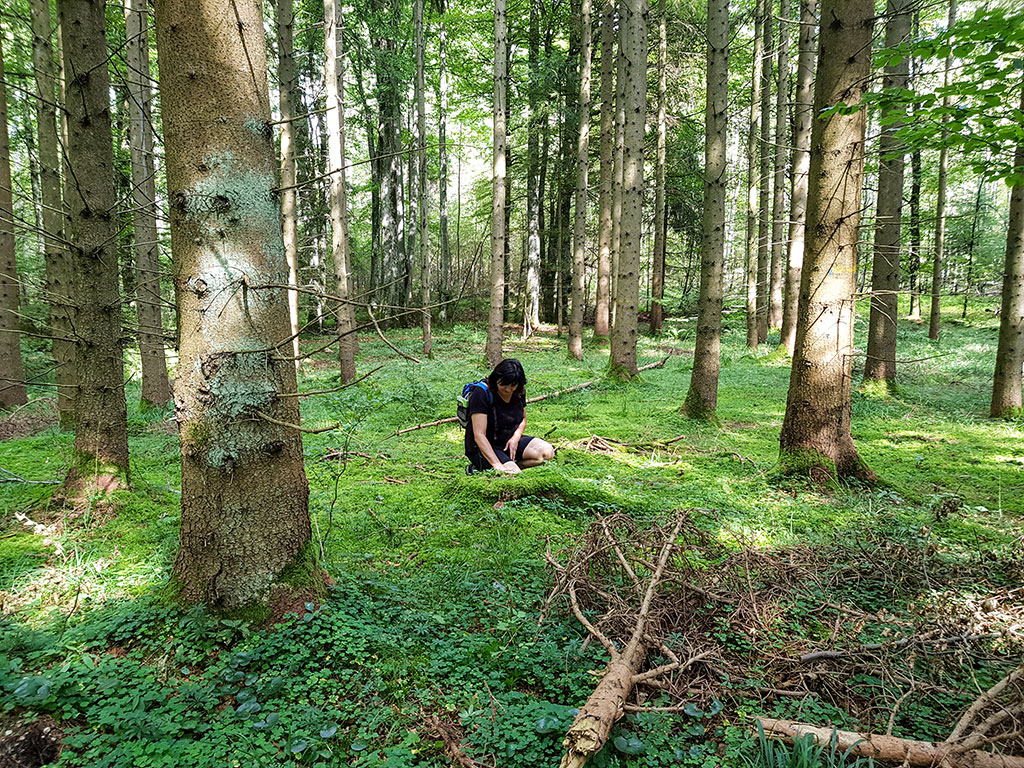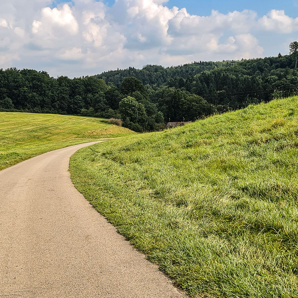 Kein Mensch weit und breit. Ok, bevor wir in den Wald abbiegen, kreuzen noch zwei Radfahrer den Weg… Der schöne Waldweg (Hasenbergweg) steigt stetig an. Rechts und links leuchten grün Moos und Klee. Ich suche eine Weile nach einem vierblättrigen Kleeblatt, finde aber leider nur sehr giftig dreinschauende Pilze.