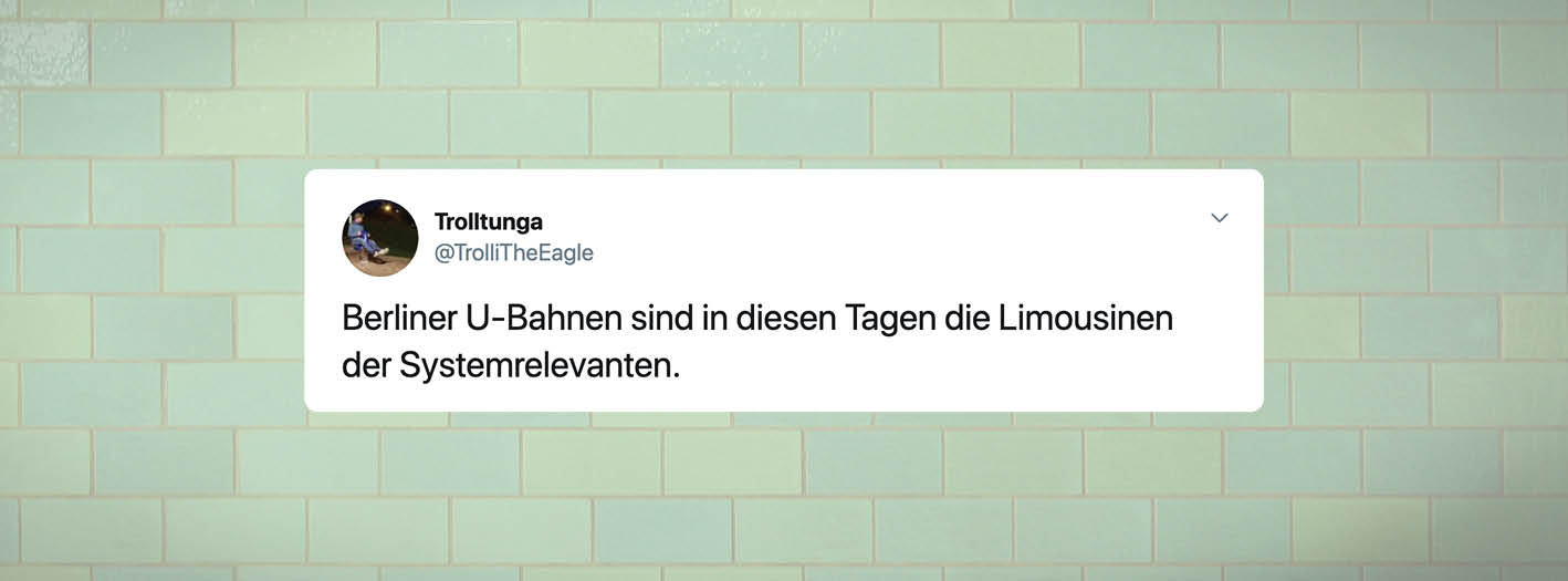 Das Wichtigste ist doch, dass wir die Krise gemeinsam gut meistern: Also, bitte passt auf euch auf und bleibt gesund! Und DANKE an alle, die den Betrieb aufrecht erhalten, und DANKE an alle, die weiterhin zuhause bleiben! Wie schreibt doch die BVG in ihrem Tweet am 18. März so schön: „Wir kurven, ihr flattet. Deal?“.