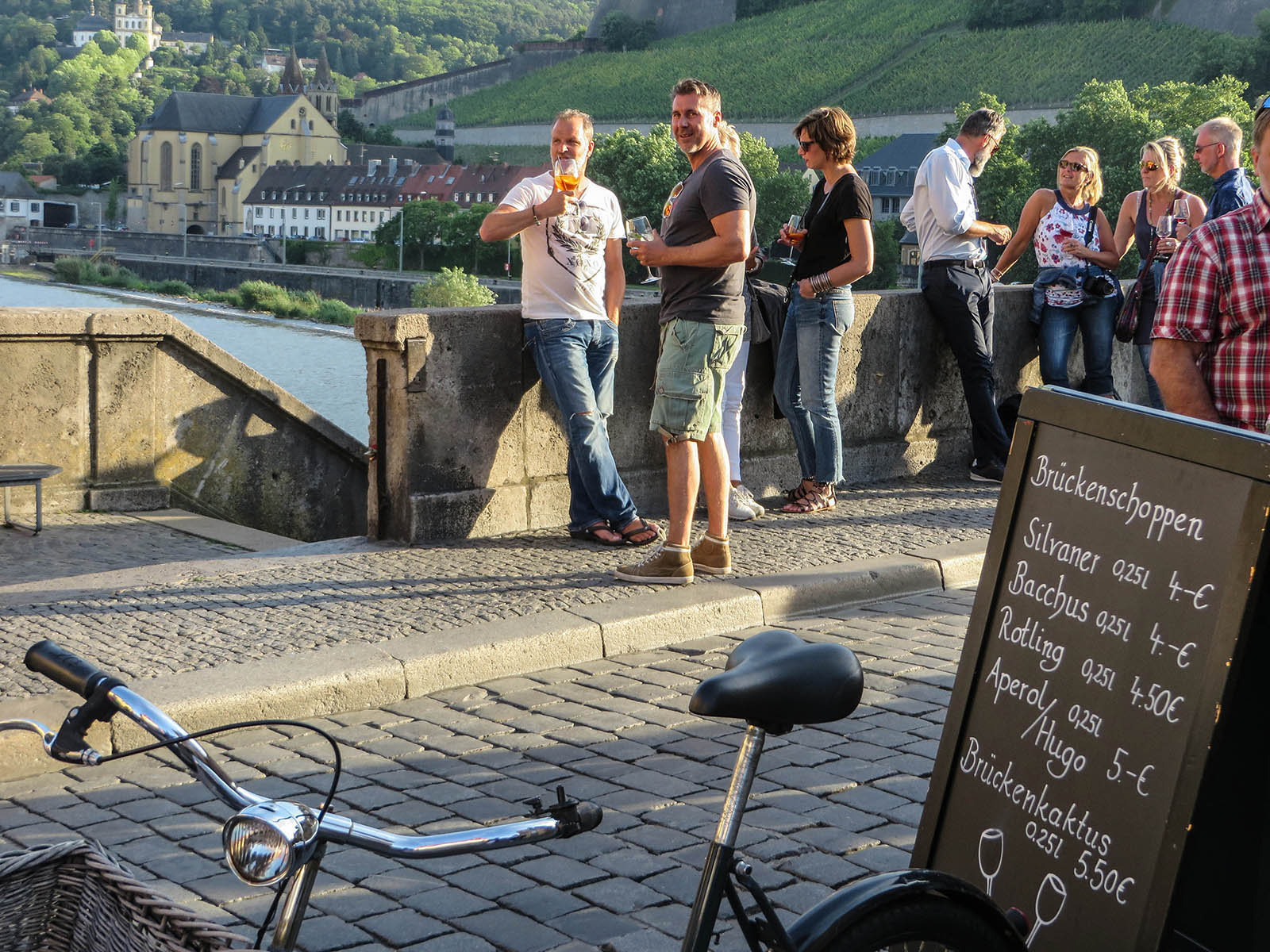 Die Brücke ist „The place to be“ in Würzburg, für Alt und Jung, für gut situierte Akademiker genauso wie für die Studenten und Straßenmusiker. Mit einem guten Glas Frankenwein und einer Bratwurst auf die Hand ist die Welt in Ordnung. Machen wir es ihnen nach.
